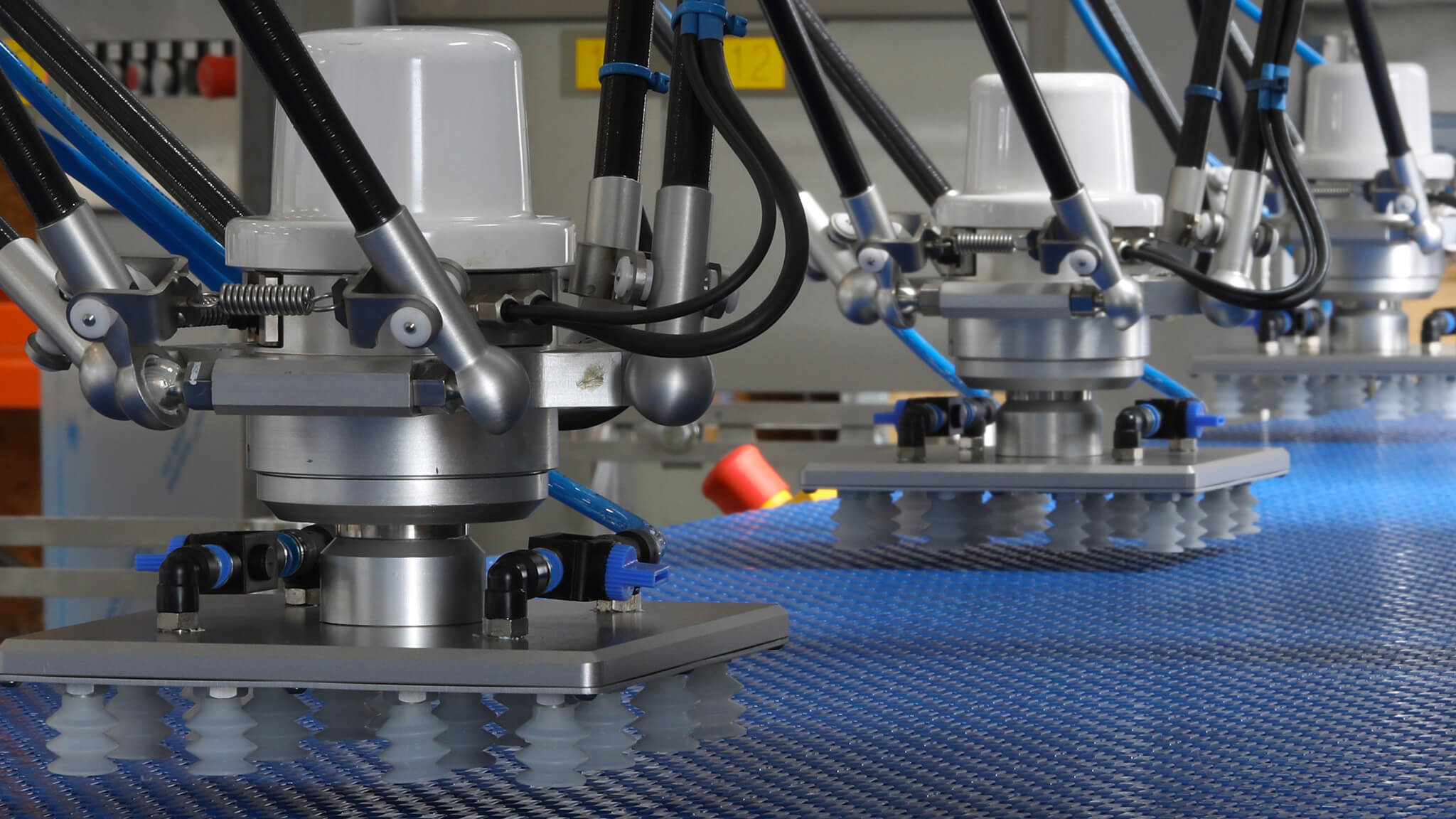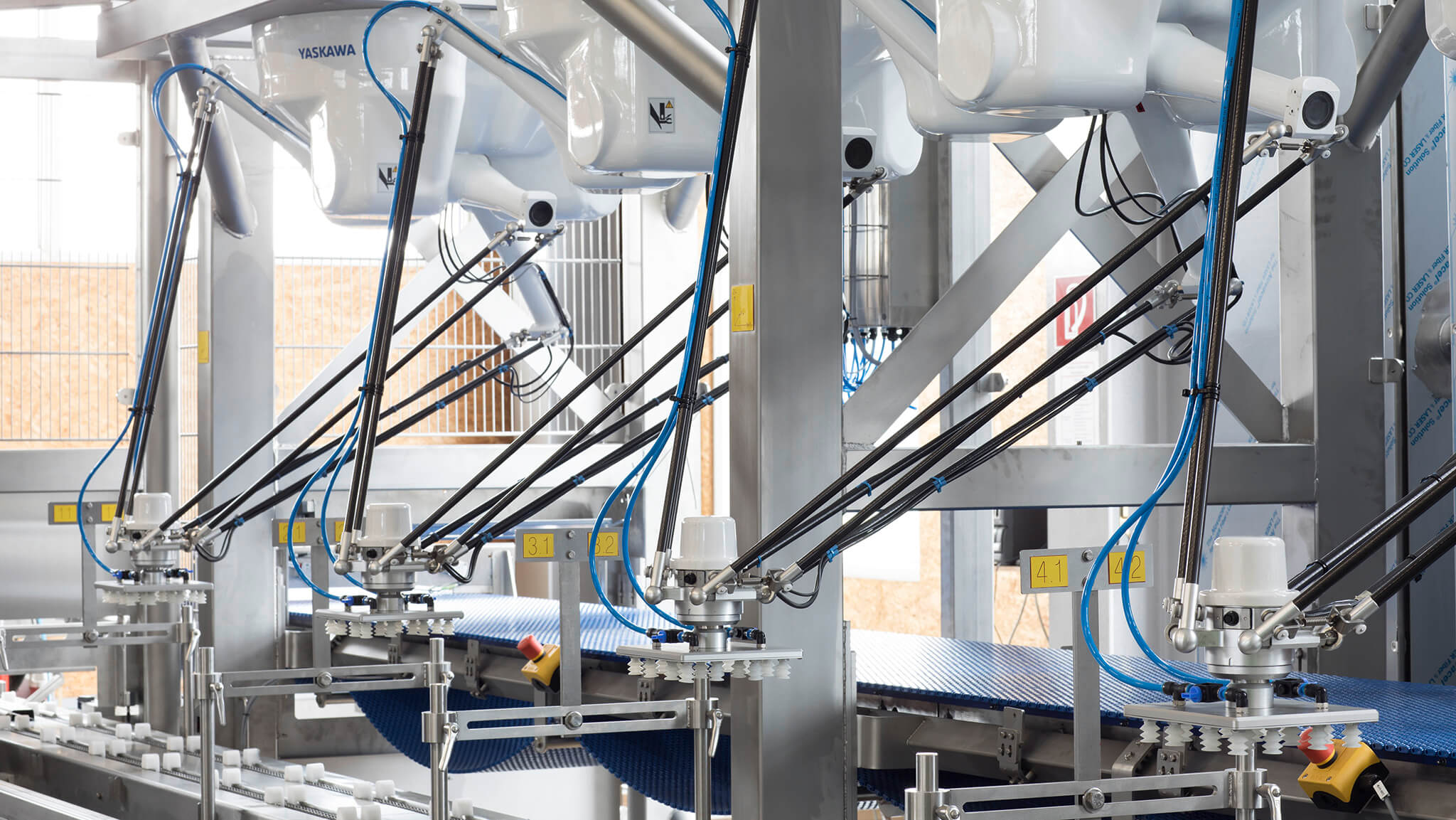 Fully automated plant for process-reliable manipulation of complex convenience products for the food industry.
