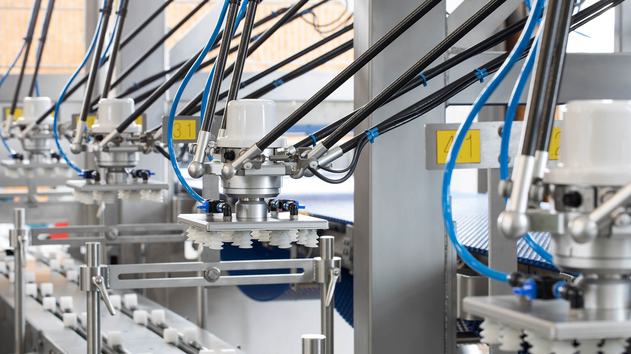 The fully automated manufacturing line for convenience products impresses as a complex, food-grade overall system with extremely efficient output.
